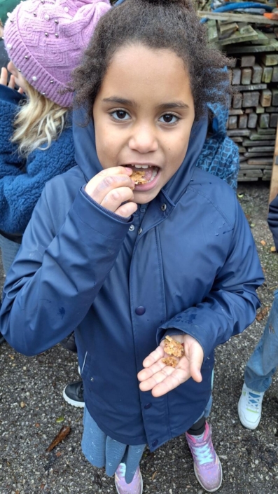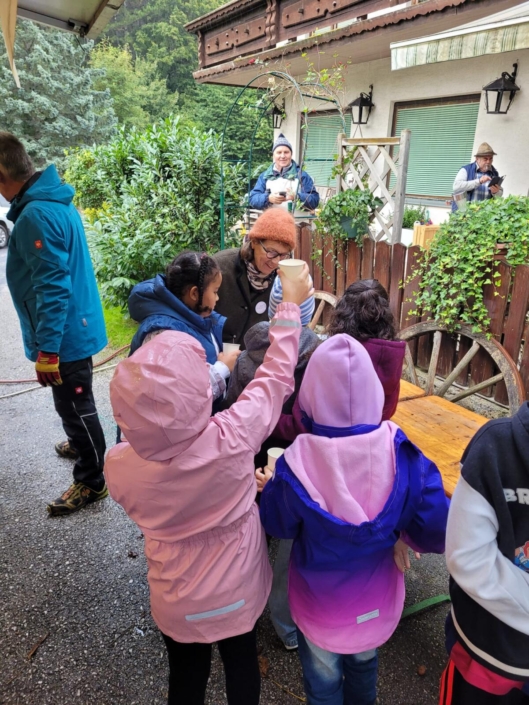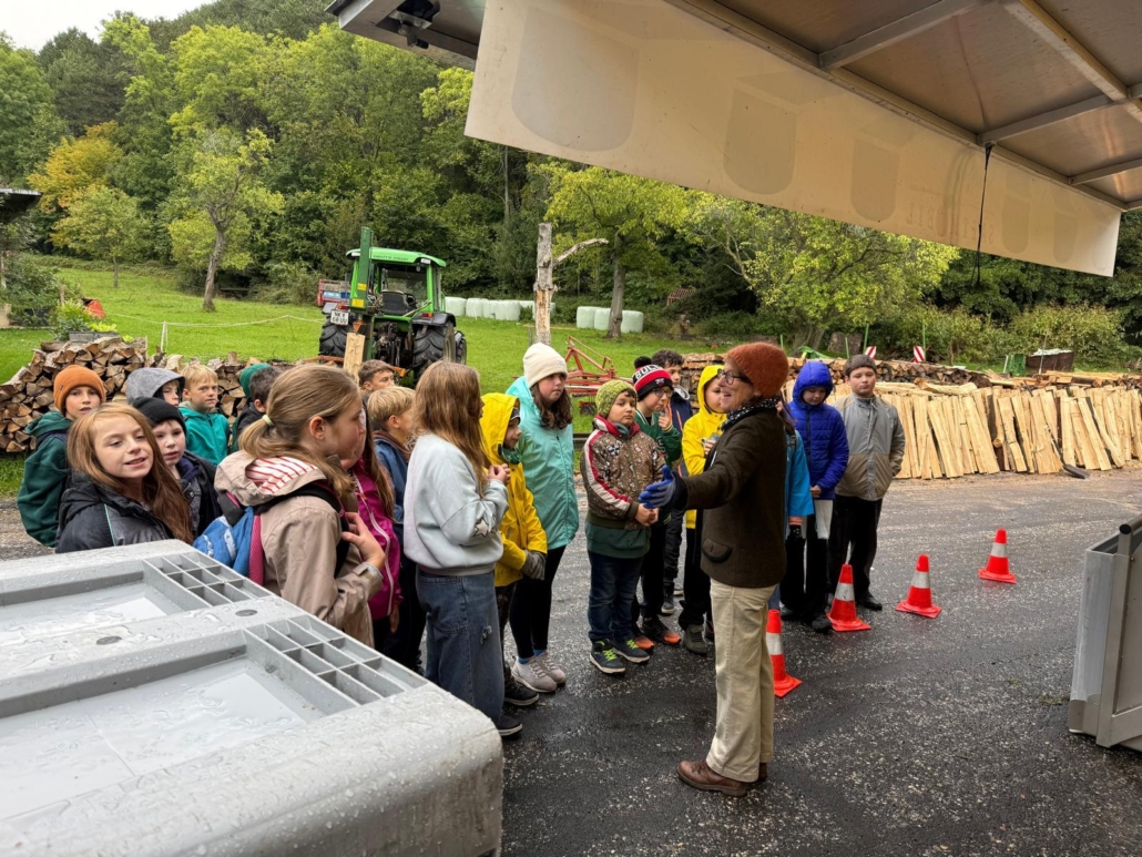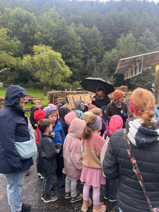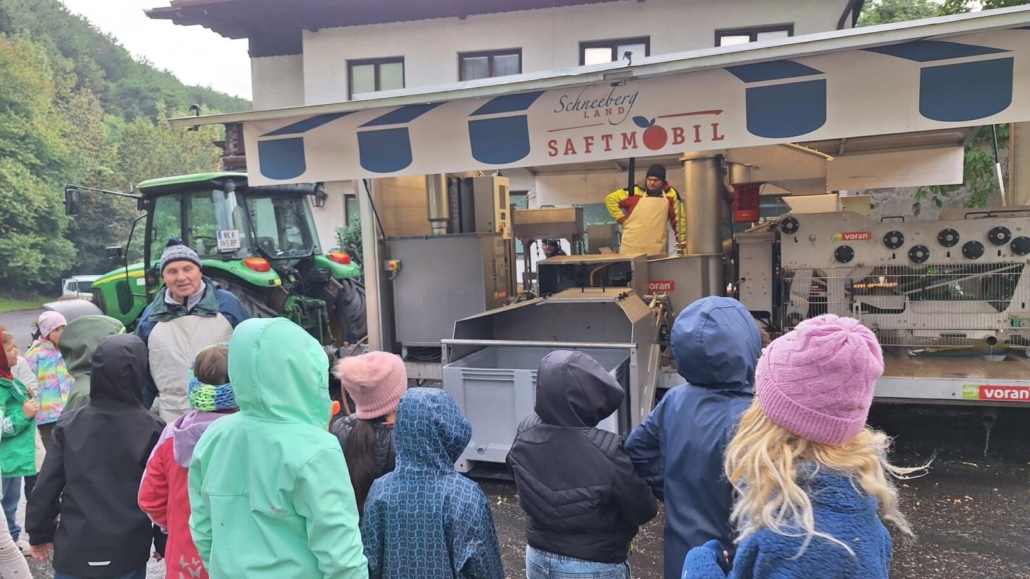 Voll Elan ging es vorbei an zwei Feuersalamandern zum Talbauern, wo Frau Hozang schon auf uns wartete und den Kindern den Vorgang des Apfelpressens erklärte.  Noch Vorort konnten die Kinder eine Kostprobe nehmen.